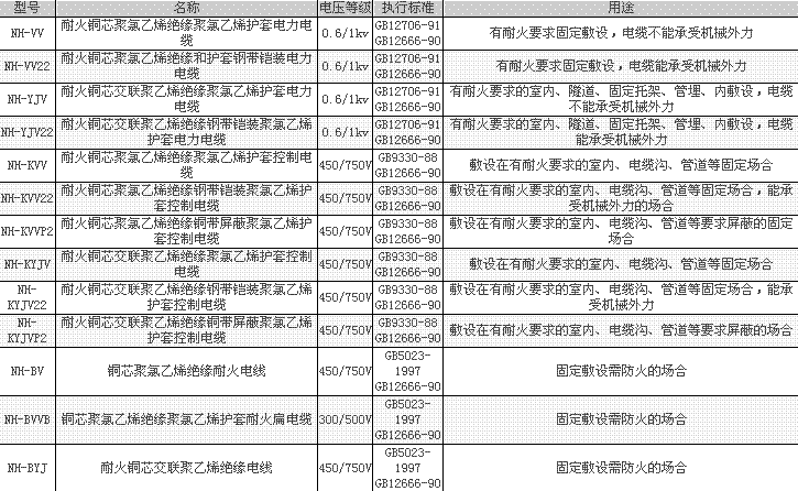 本產(chǎn)品適用于固定敷設(shè)需防火的場合。如高層建筑、地下鐵道、核電站、發(fā)電廠、機場、油田、化工廠及重要的工礦企業(yè)等與消防救生有關(guān)場合,同時又是應(yīng)急電源、消防泵、電梯、通訊信號系統(tǒng)必備電纜。型號和M稱:
